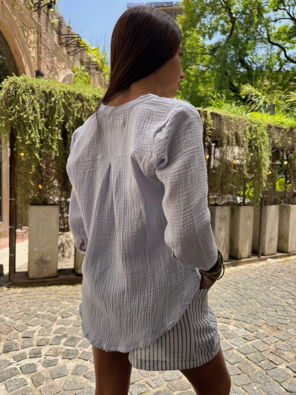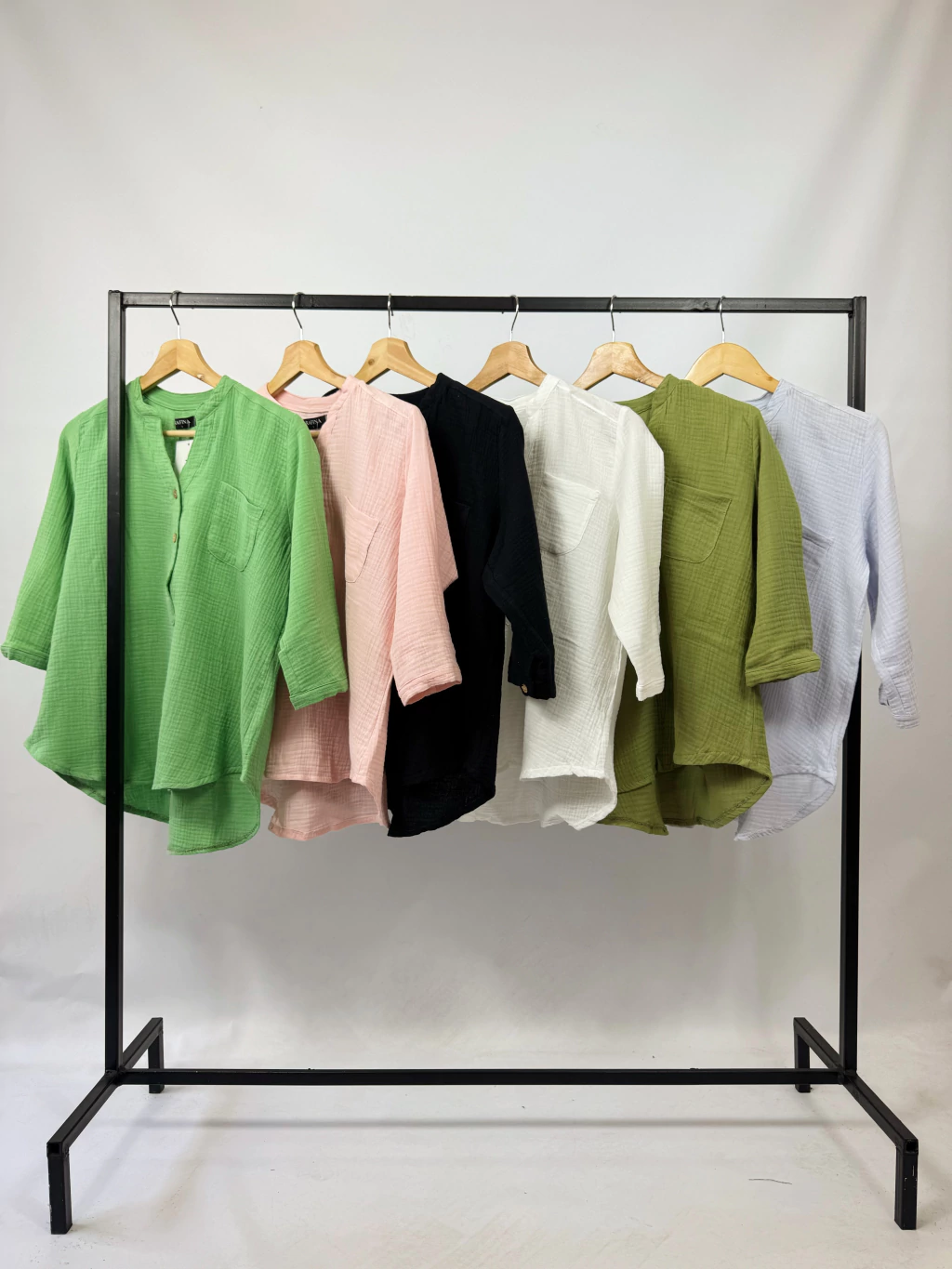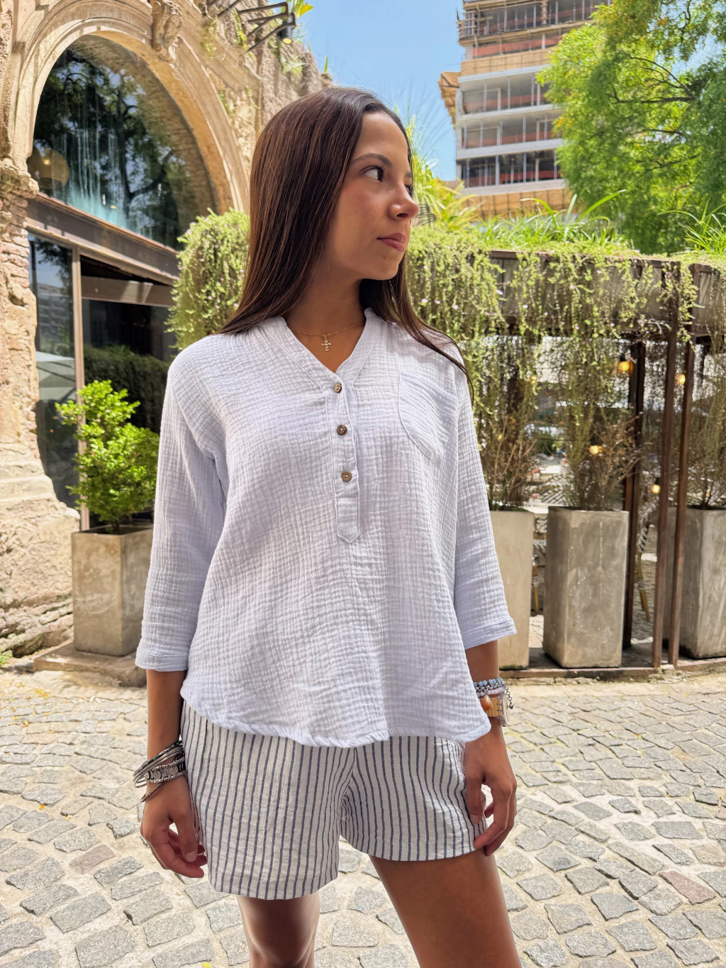 Camisa 3/4 con cuello mao y bolsillo en delantero.