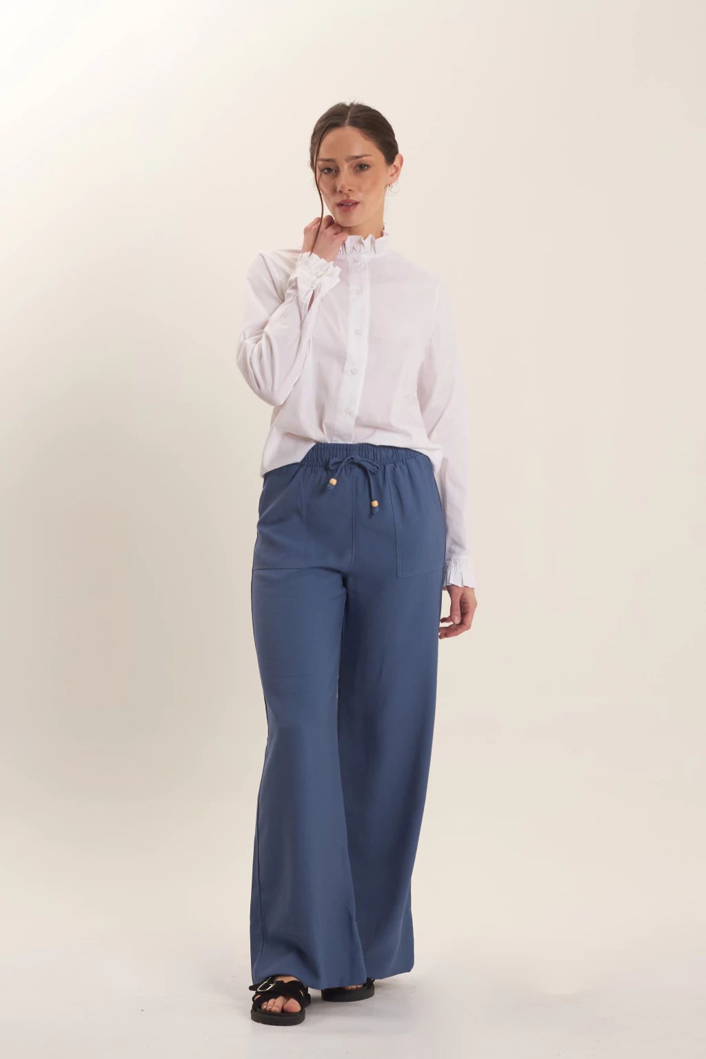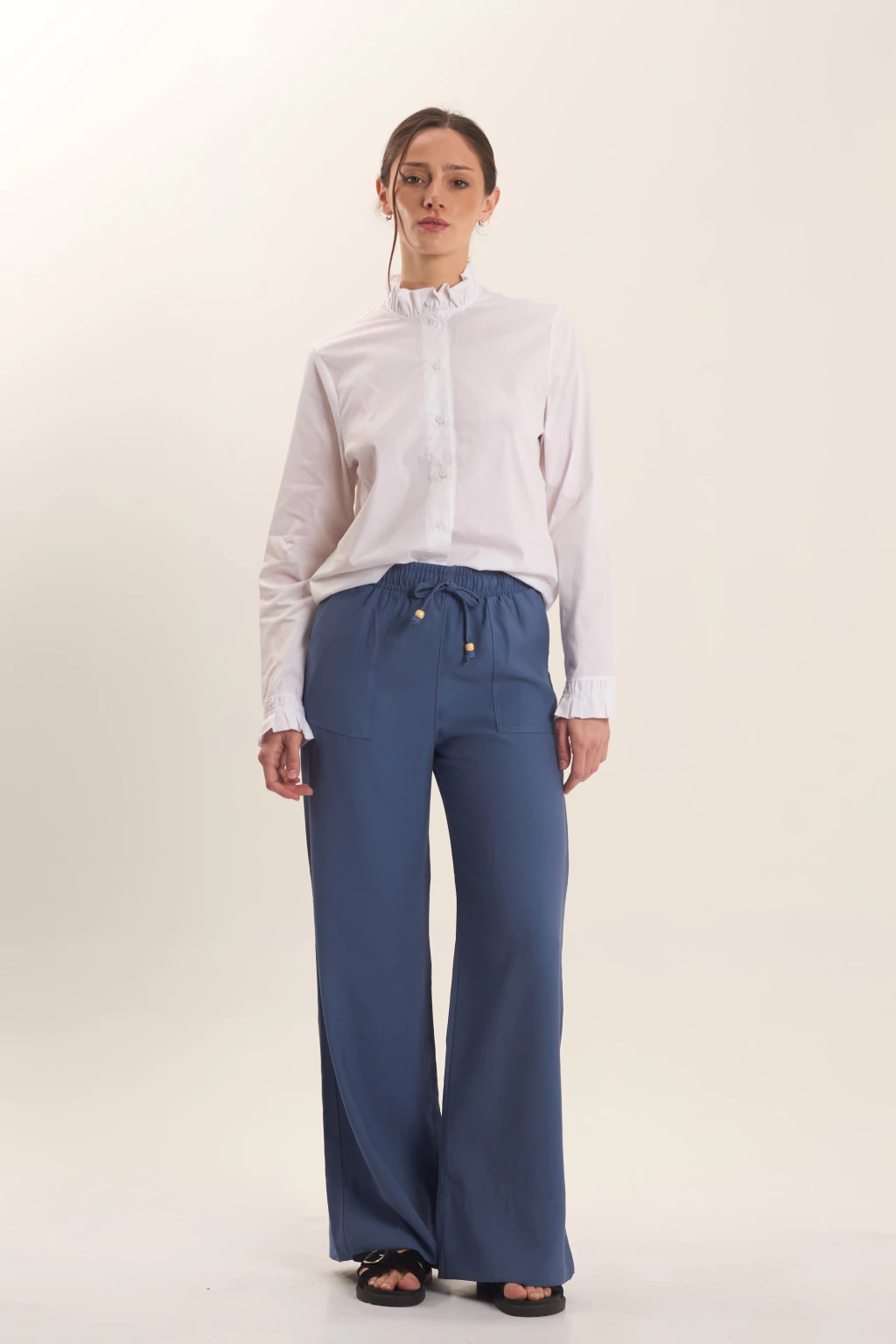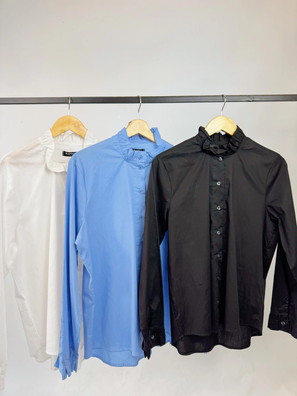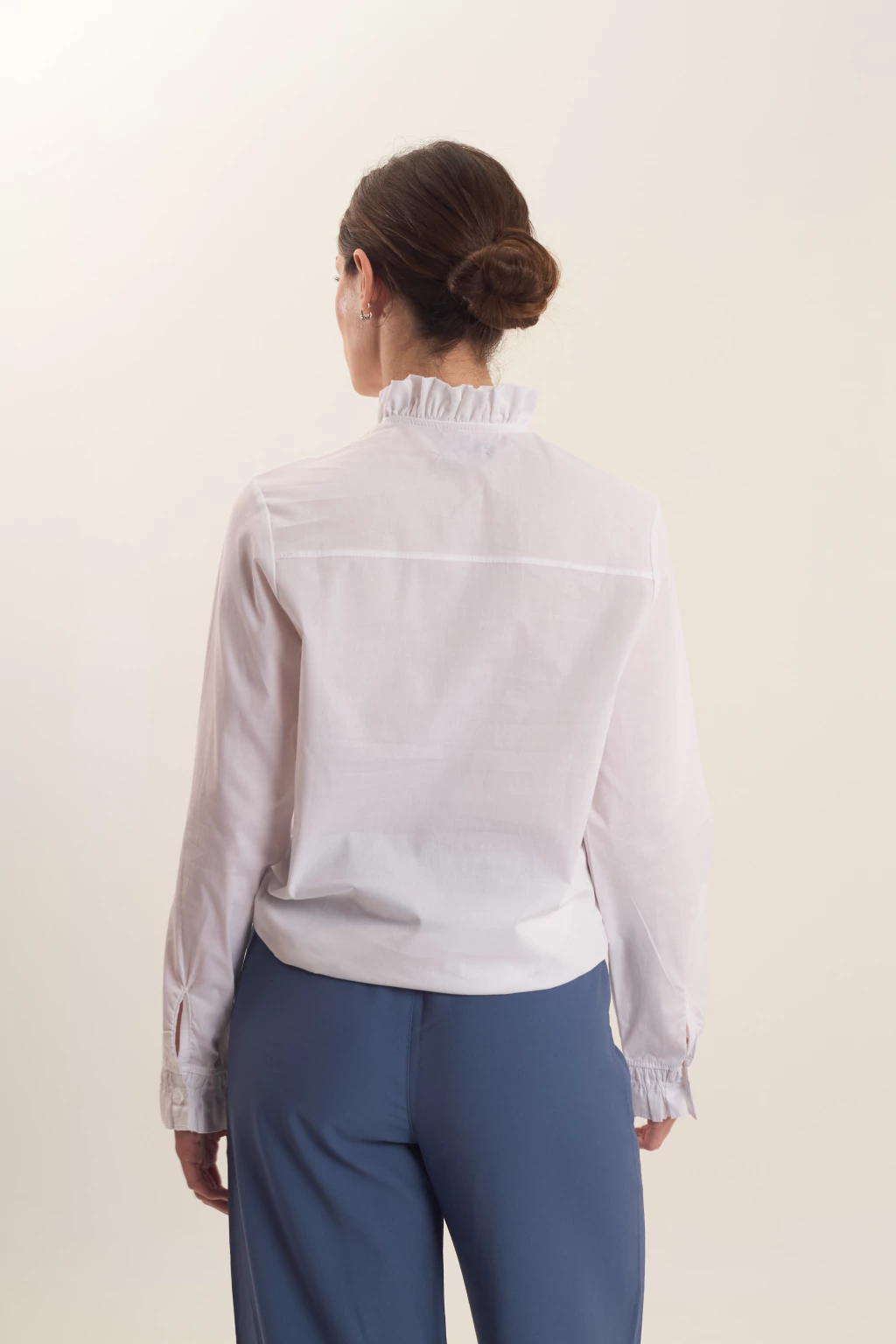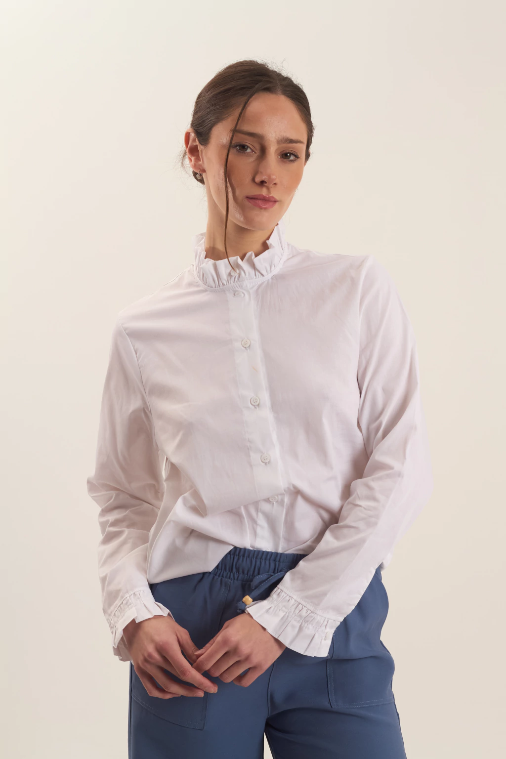 Camisa de cuello alto de volados, mismo recurso en los puños.