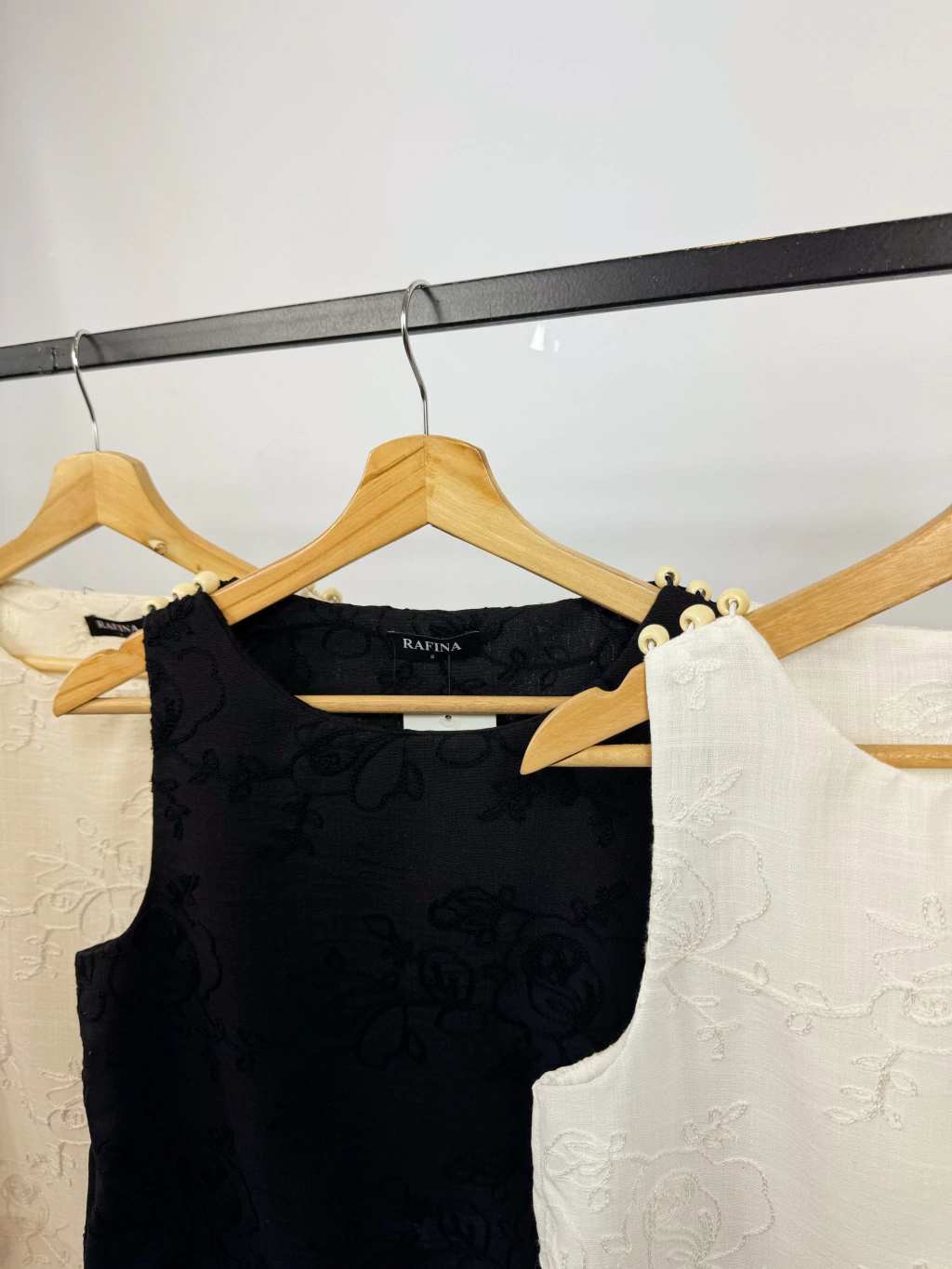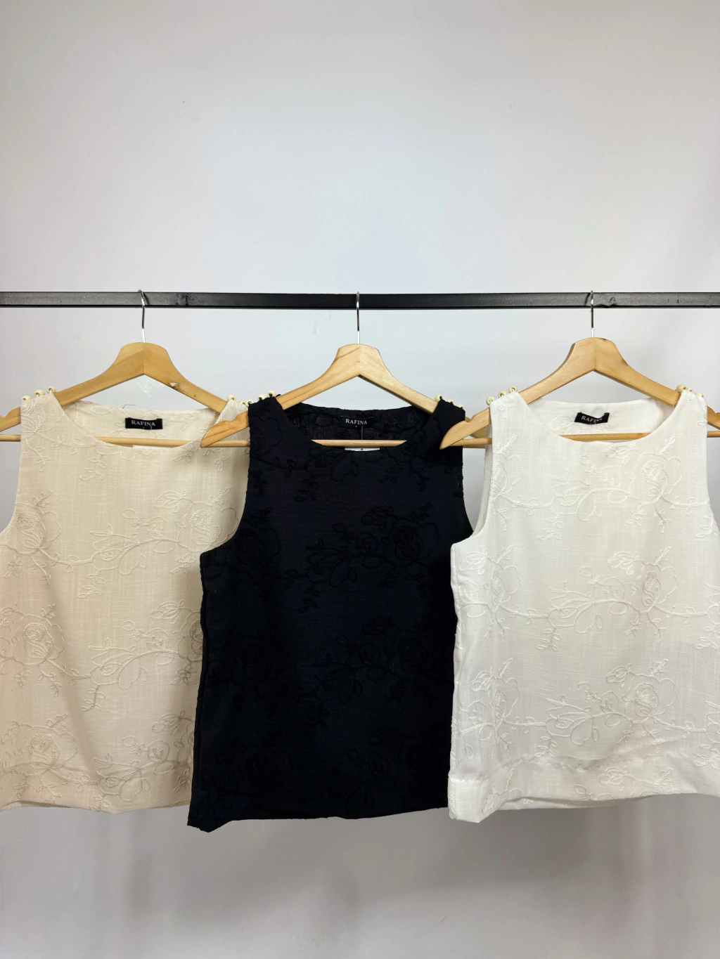 Musculosa de cuello cerrado con detalle de mostacillas en hombros.