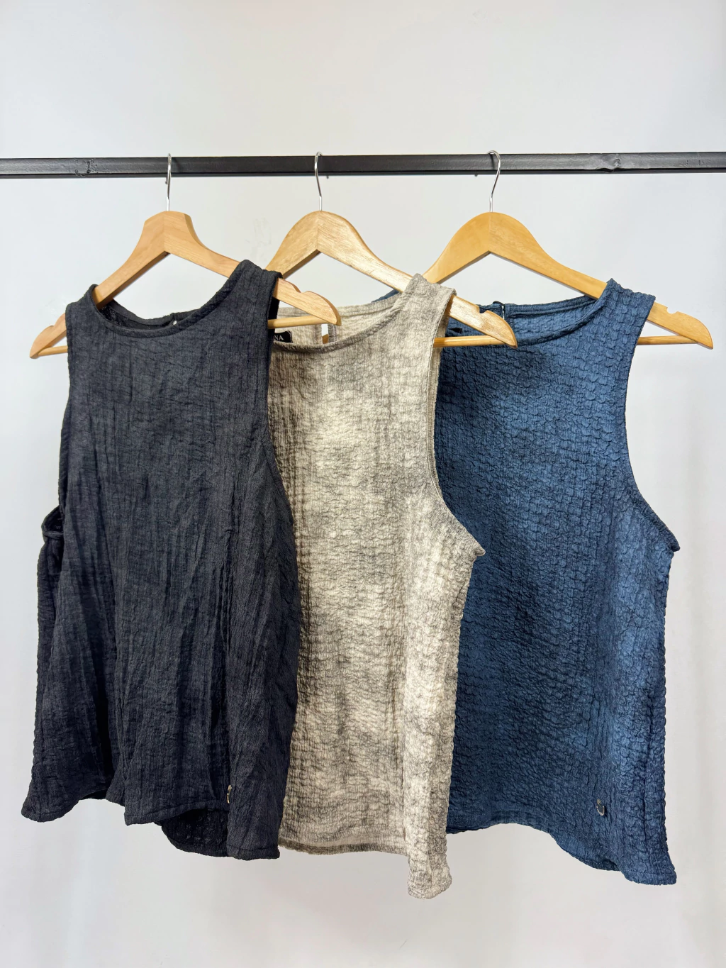 Musculosa de cuello redondo, cuenta con un pequeño botón en la parte trasera del cuello para un cómodo acceso.