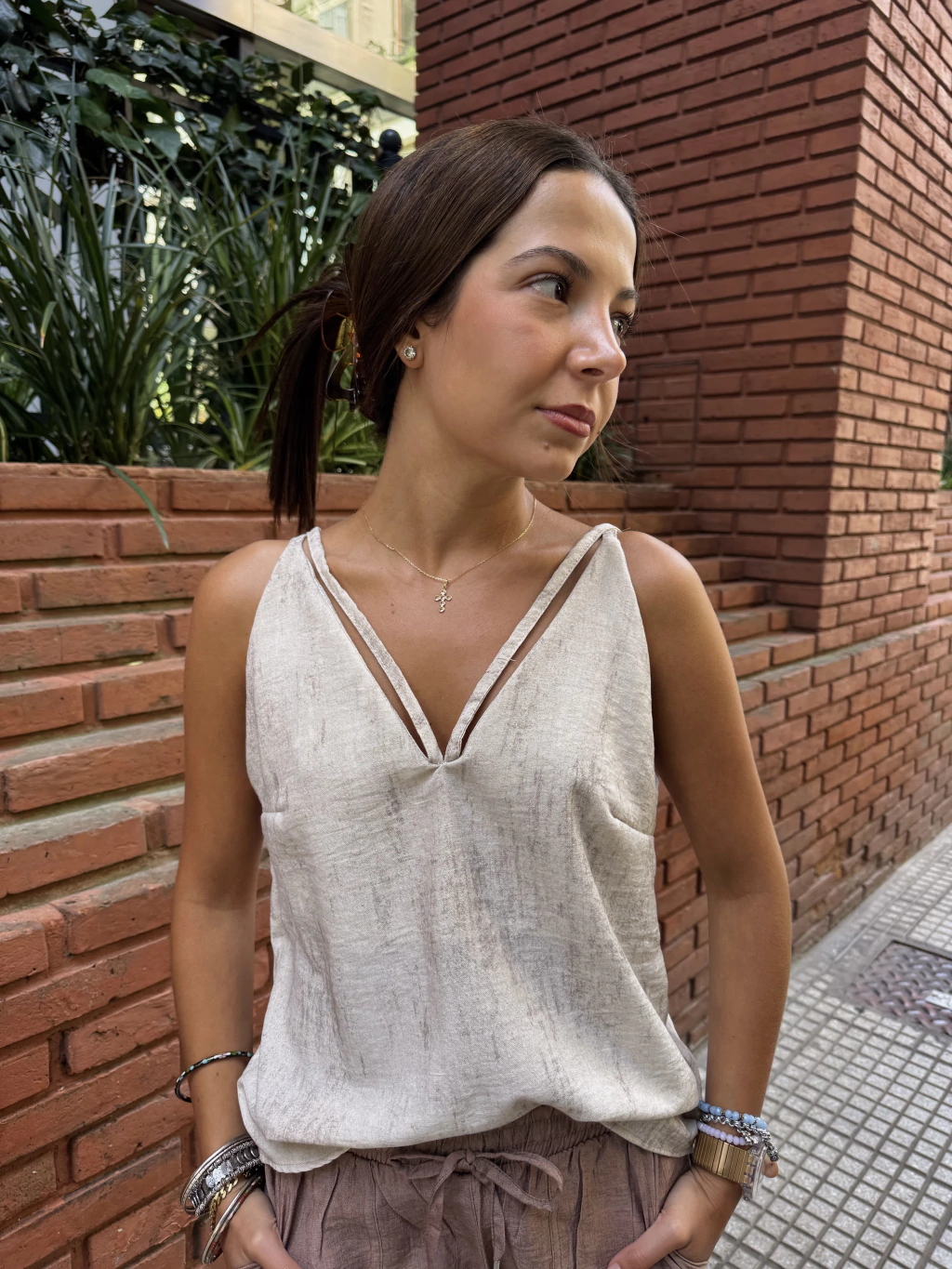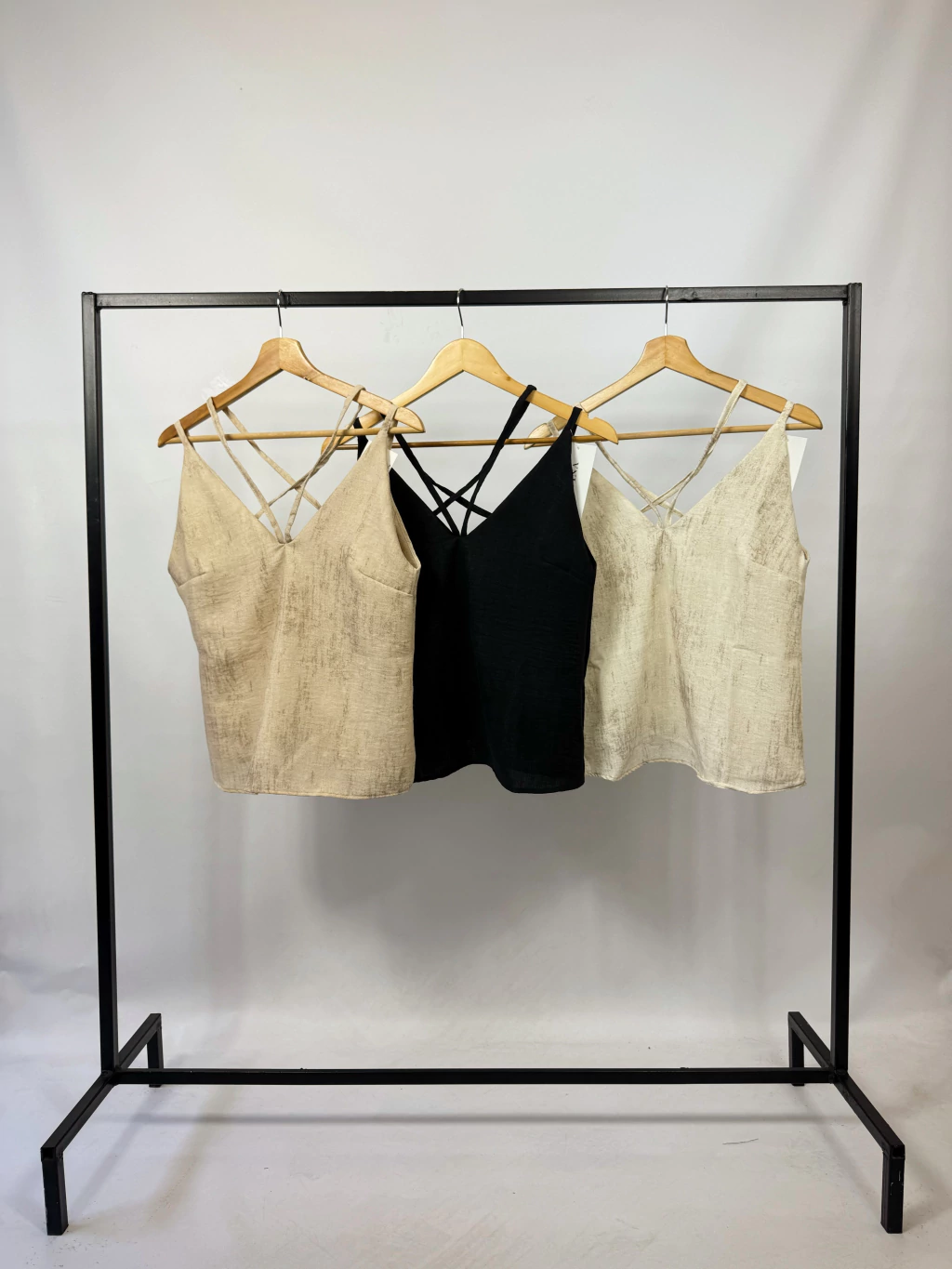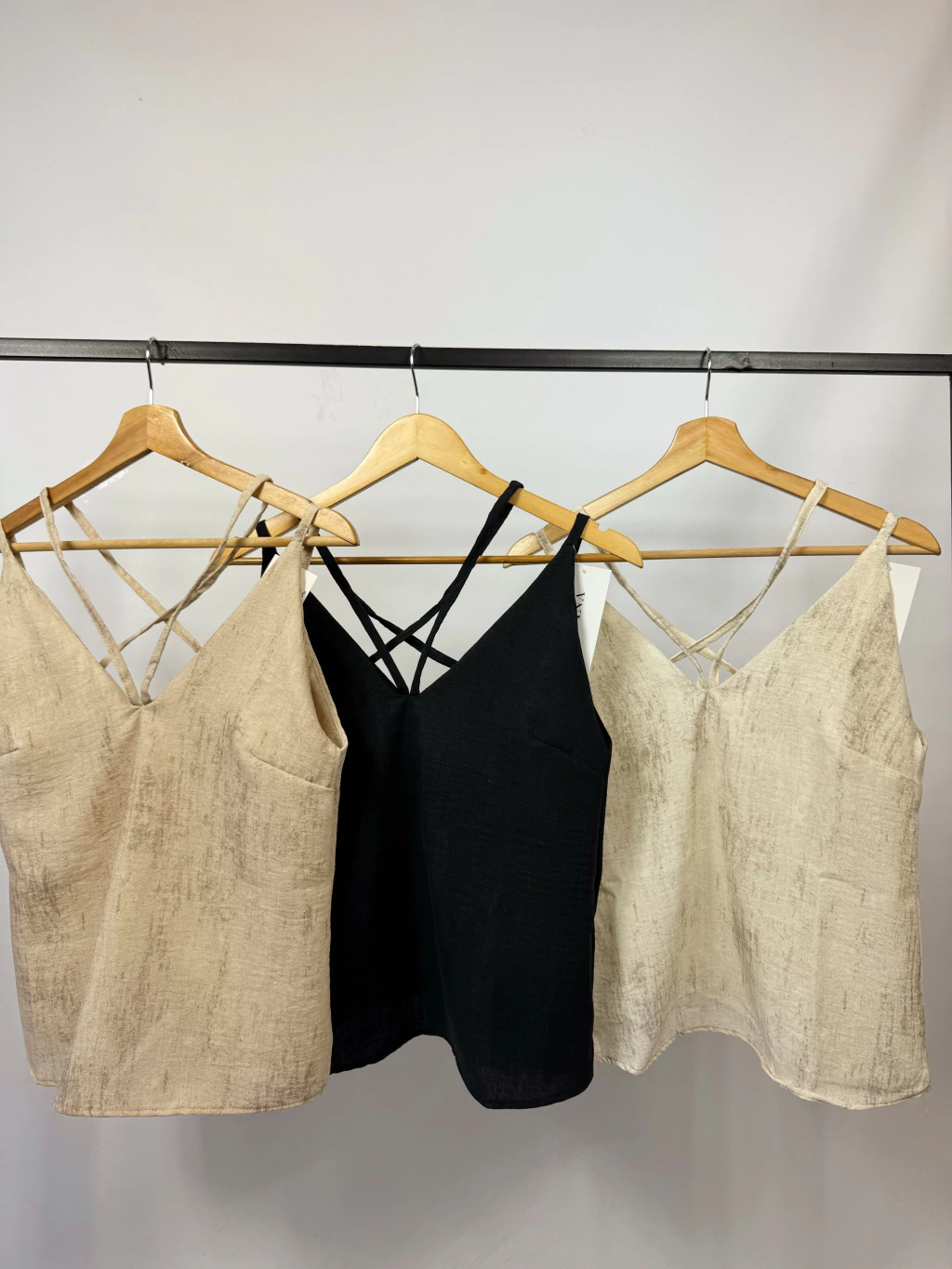 Musculosa con tiras que empiezan en el escote y se cruzan en la espalda.
