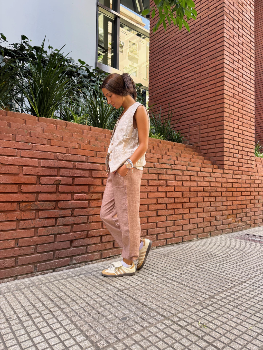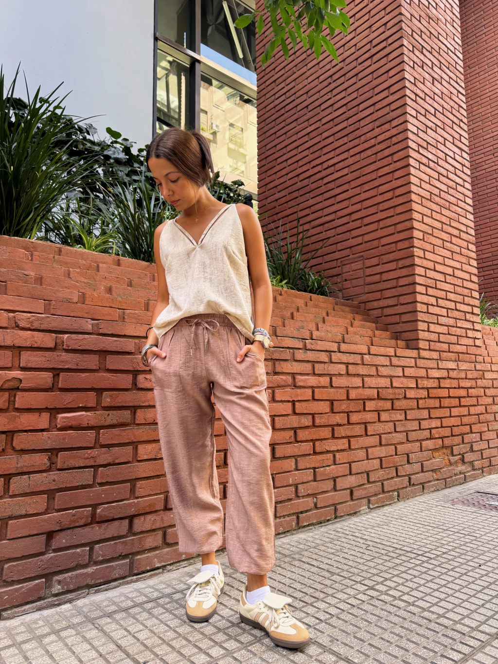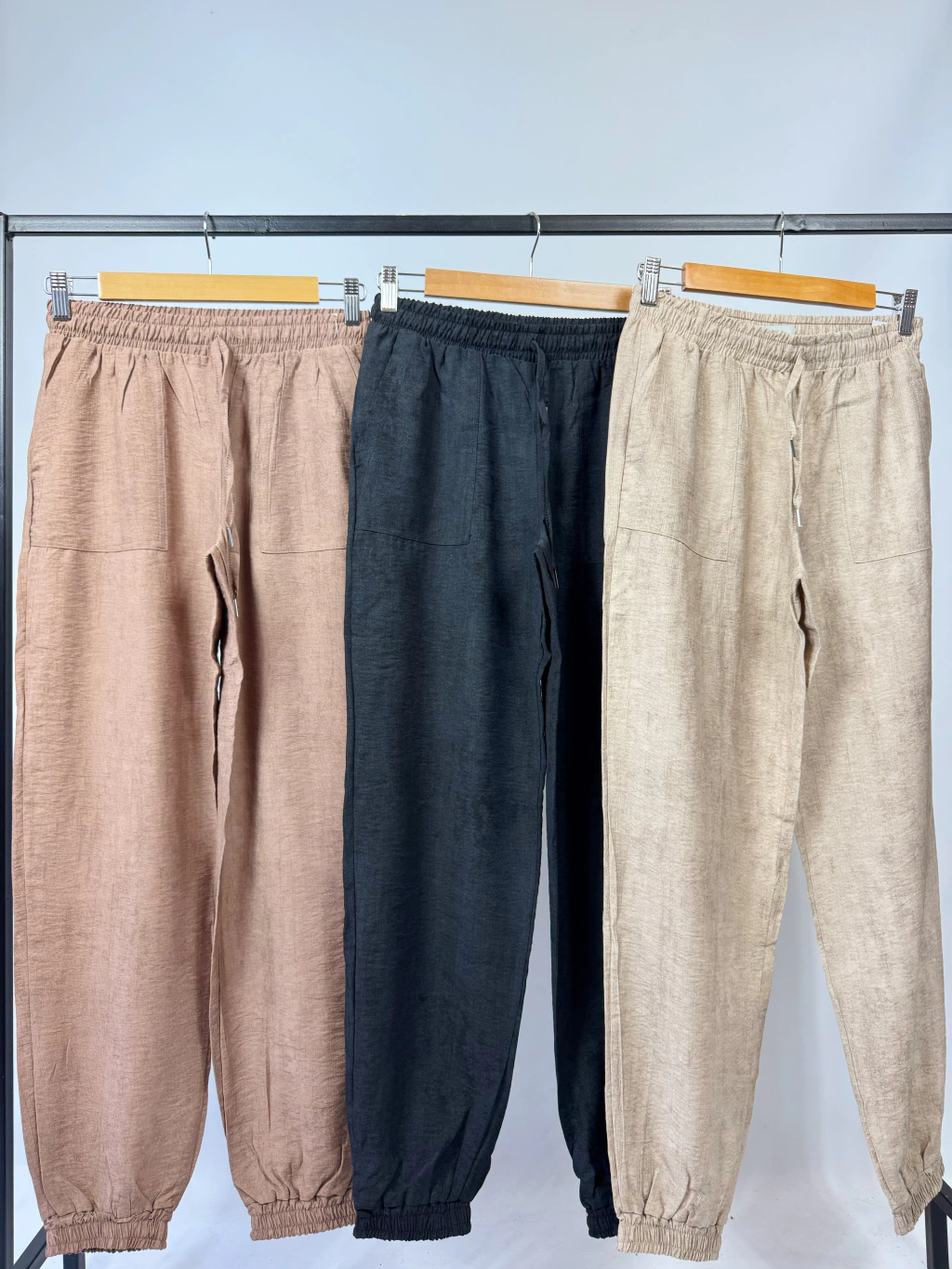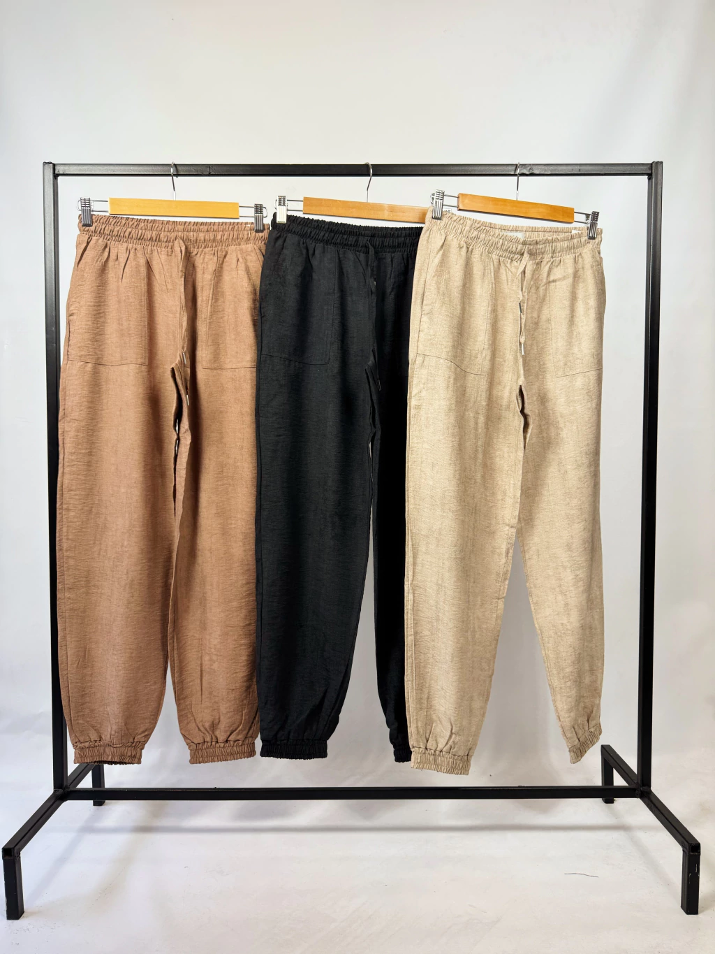 Pantalón con cintura elastizada y elástico en los puños, posee bolsillos.