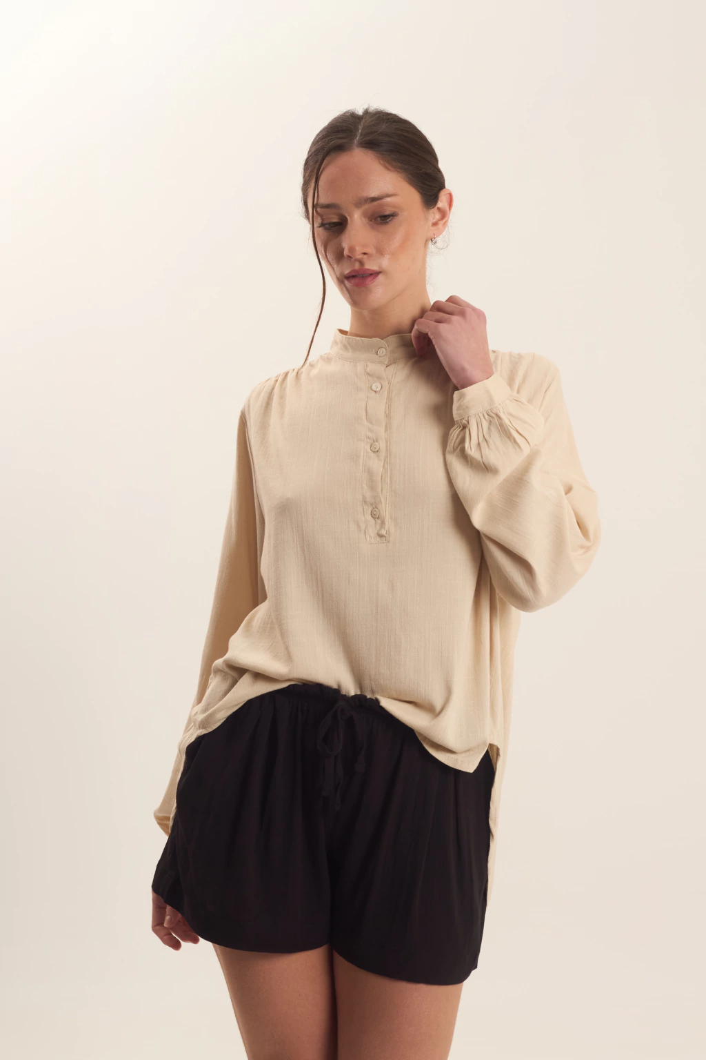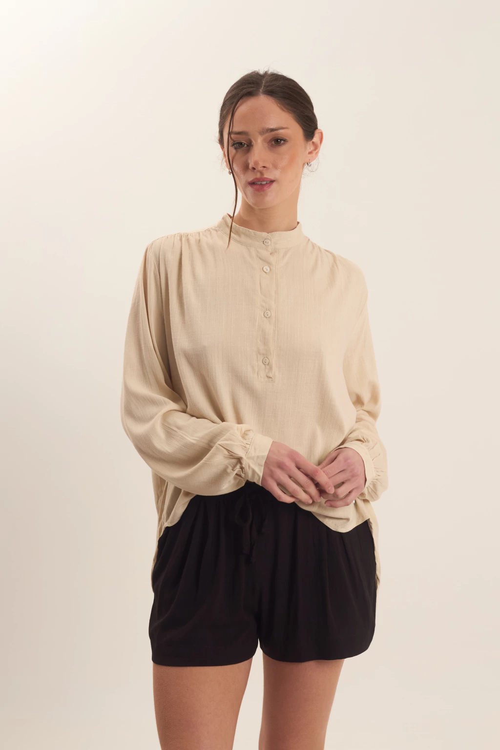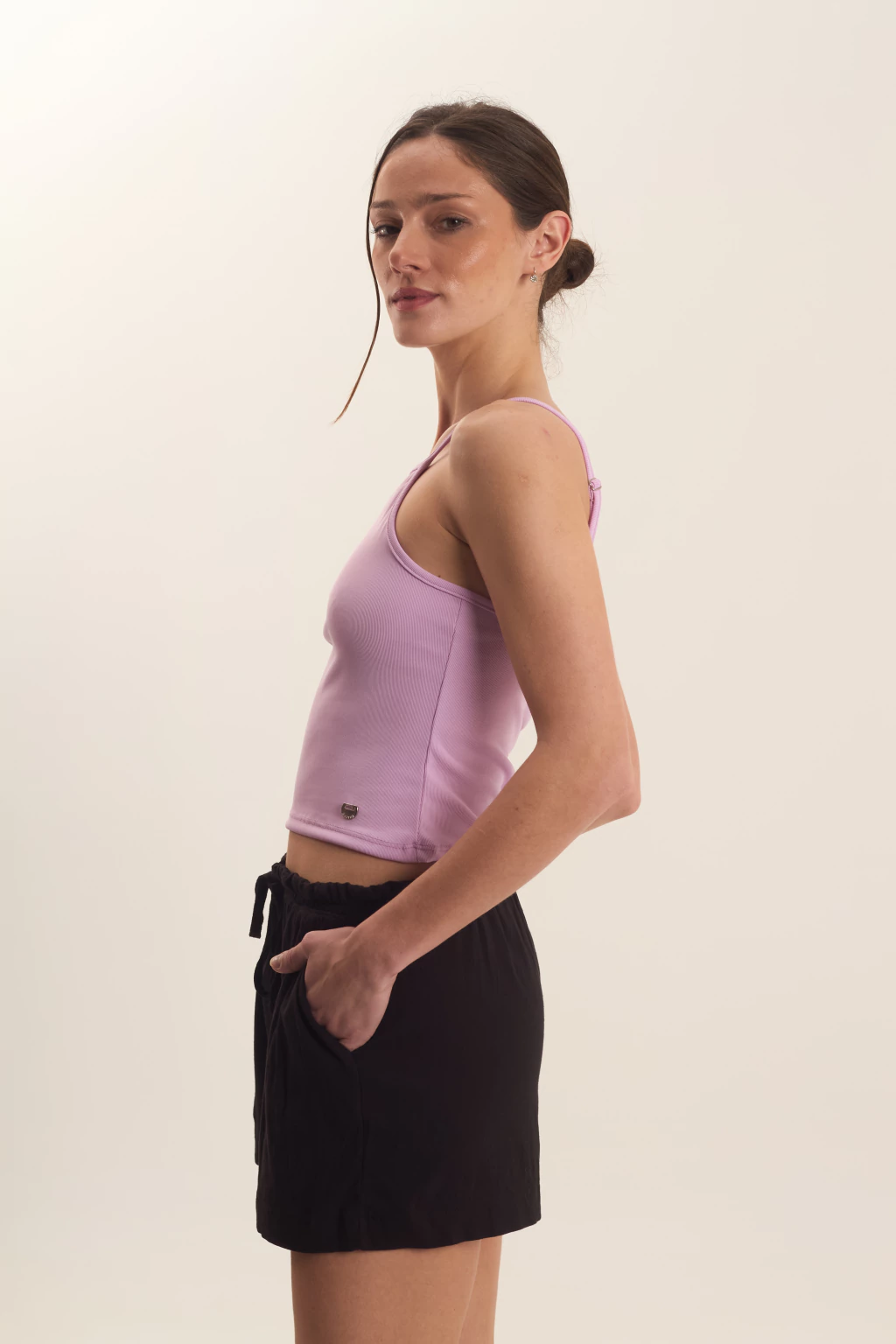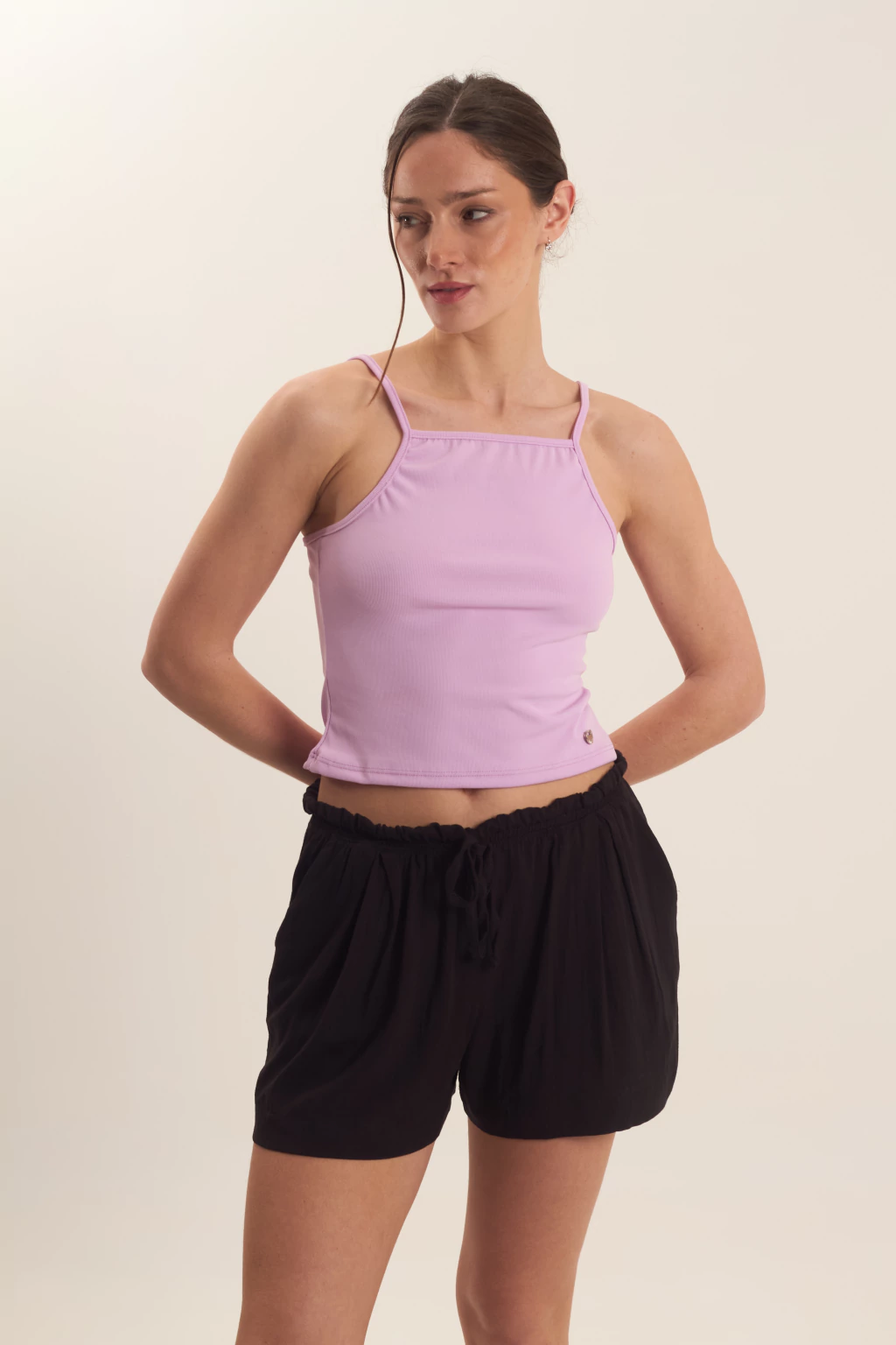 Short con cintura elastizada con lazo para atar, posee bolsillos.